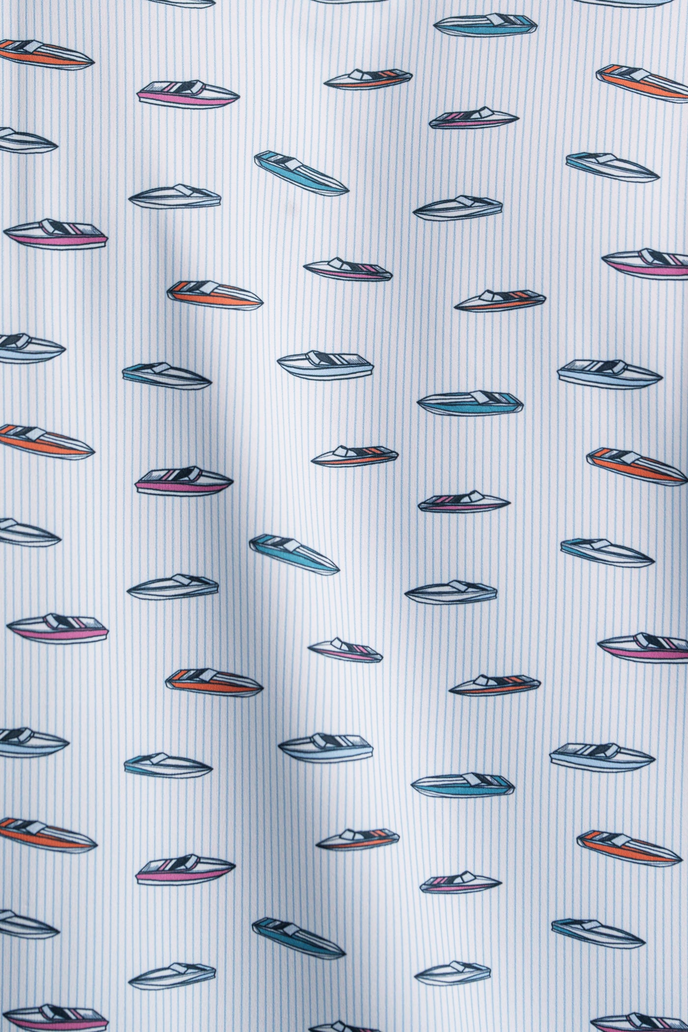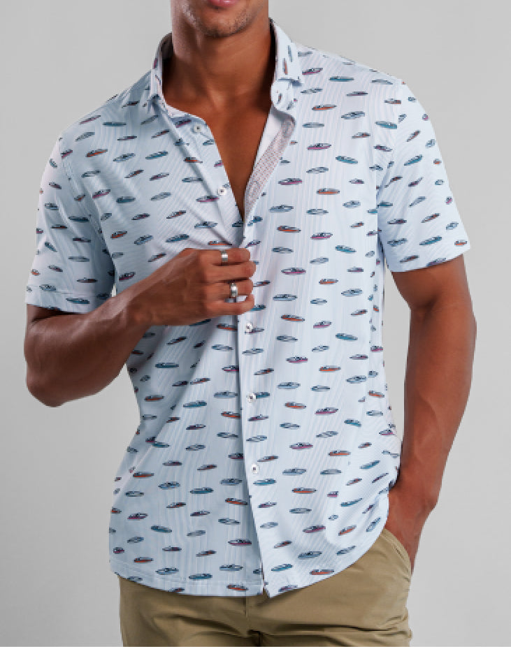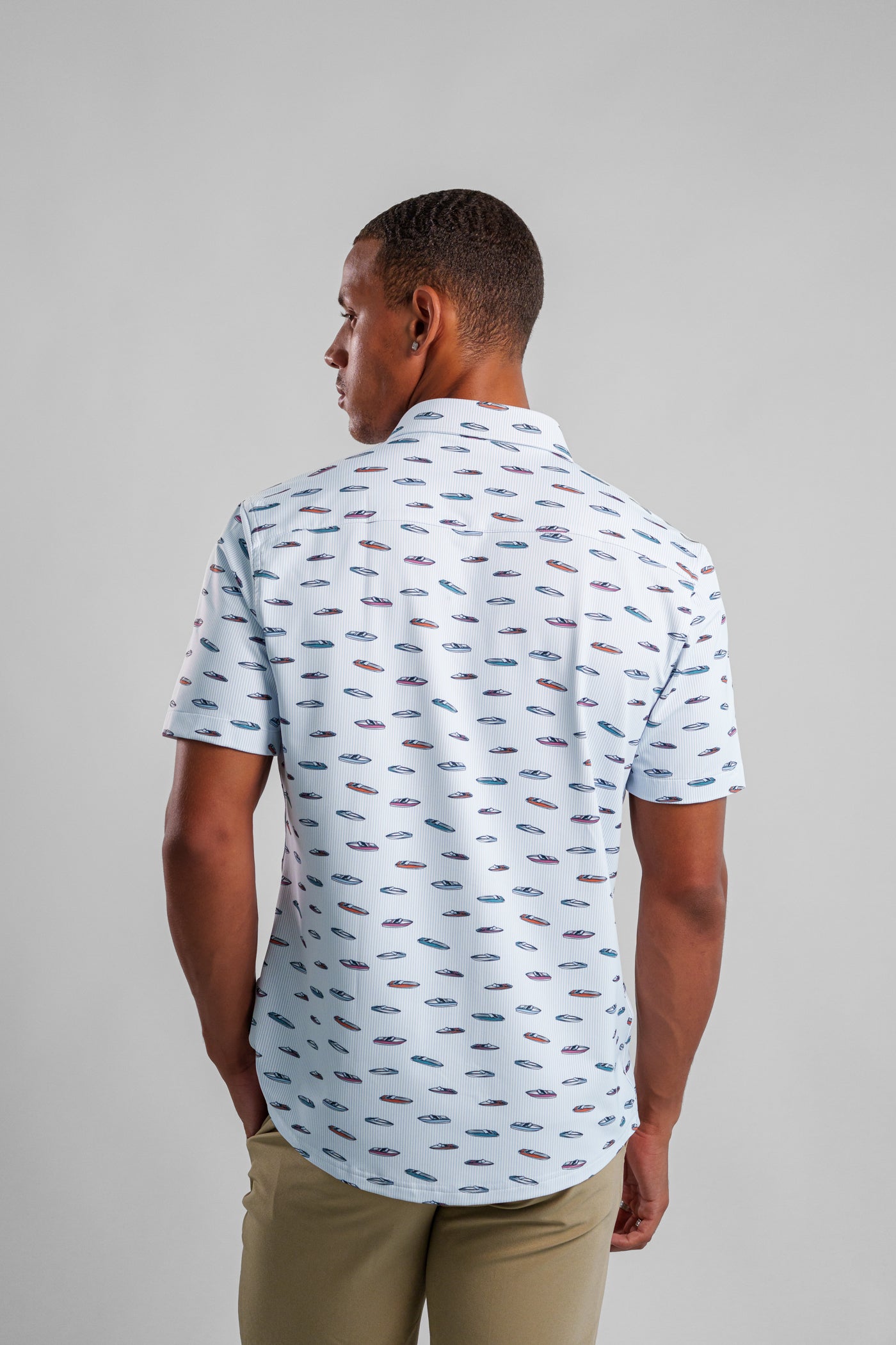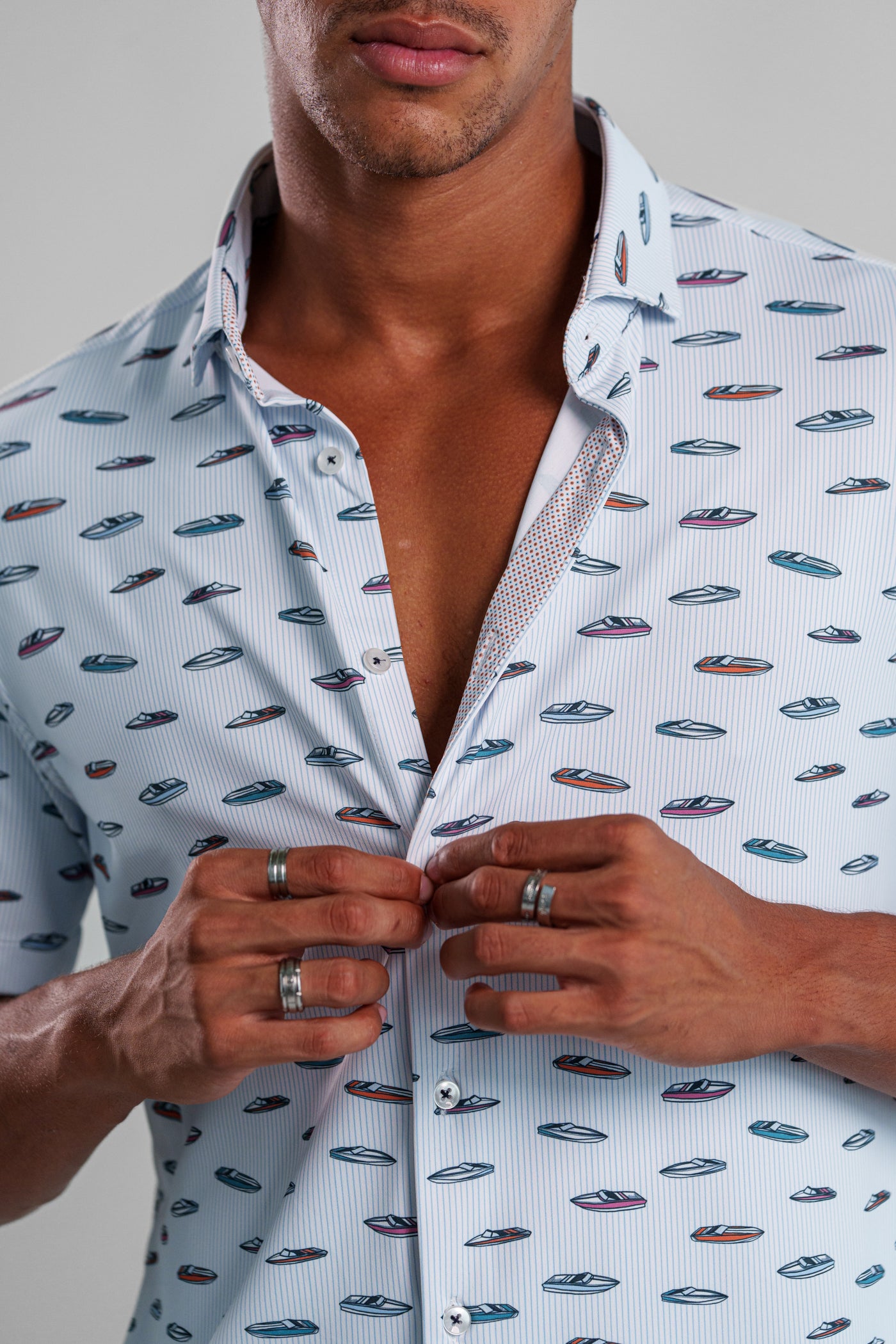 Bring a playful twist to your wardrobe with the APEX Miami Vice Speeders Short Sleeve Shirt, showcasing a lively light blue print inspired by coastal vibes.
