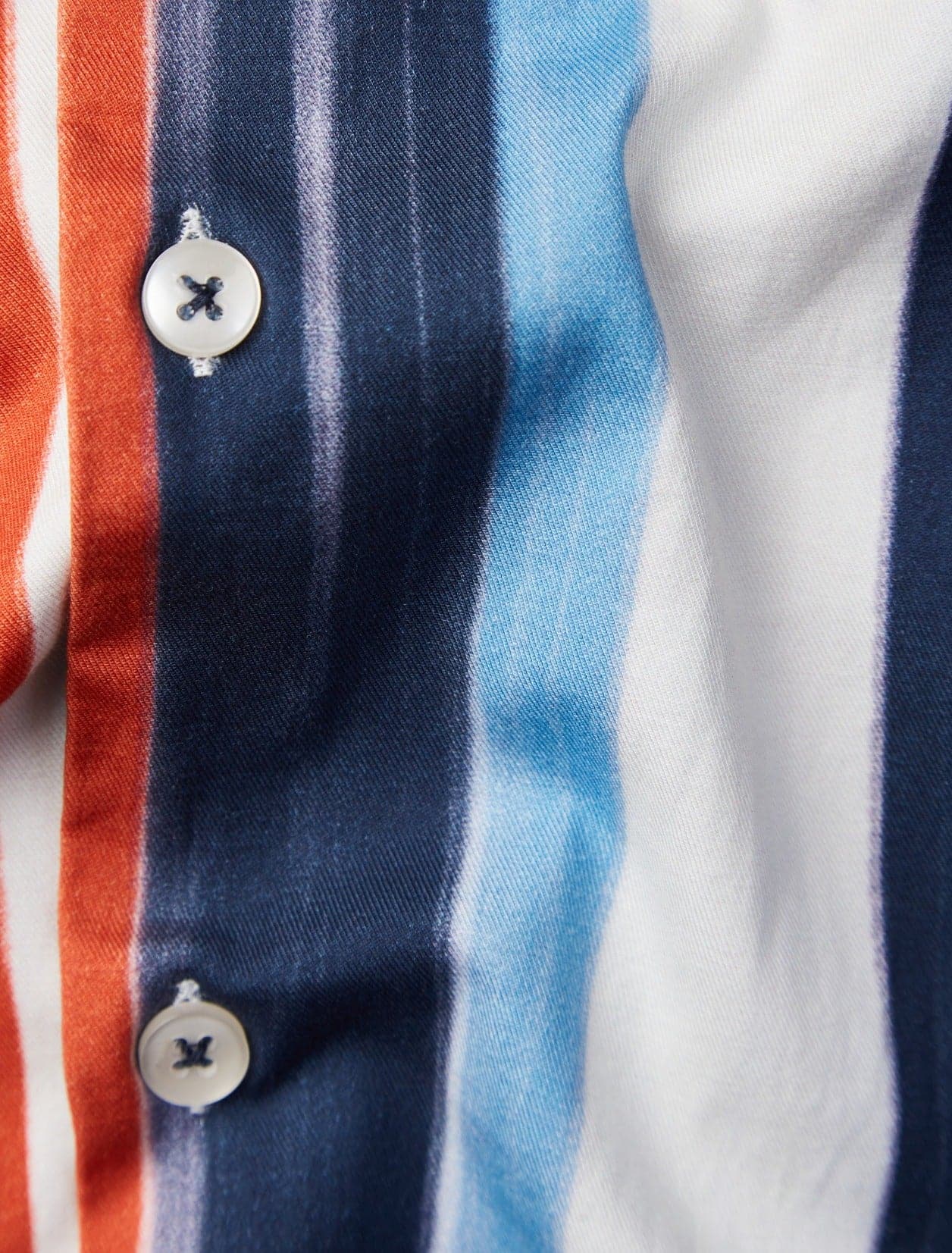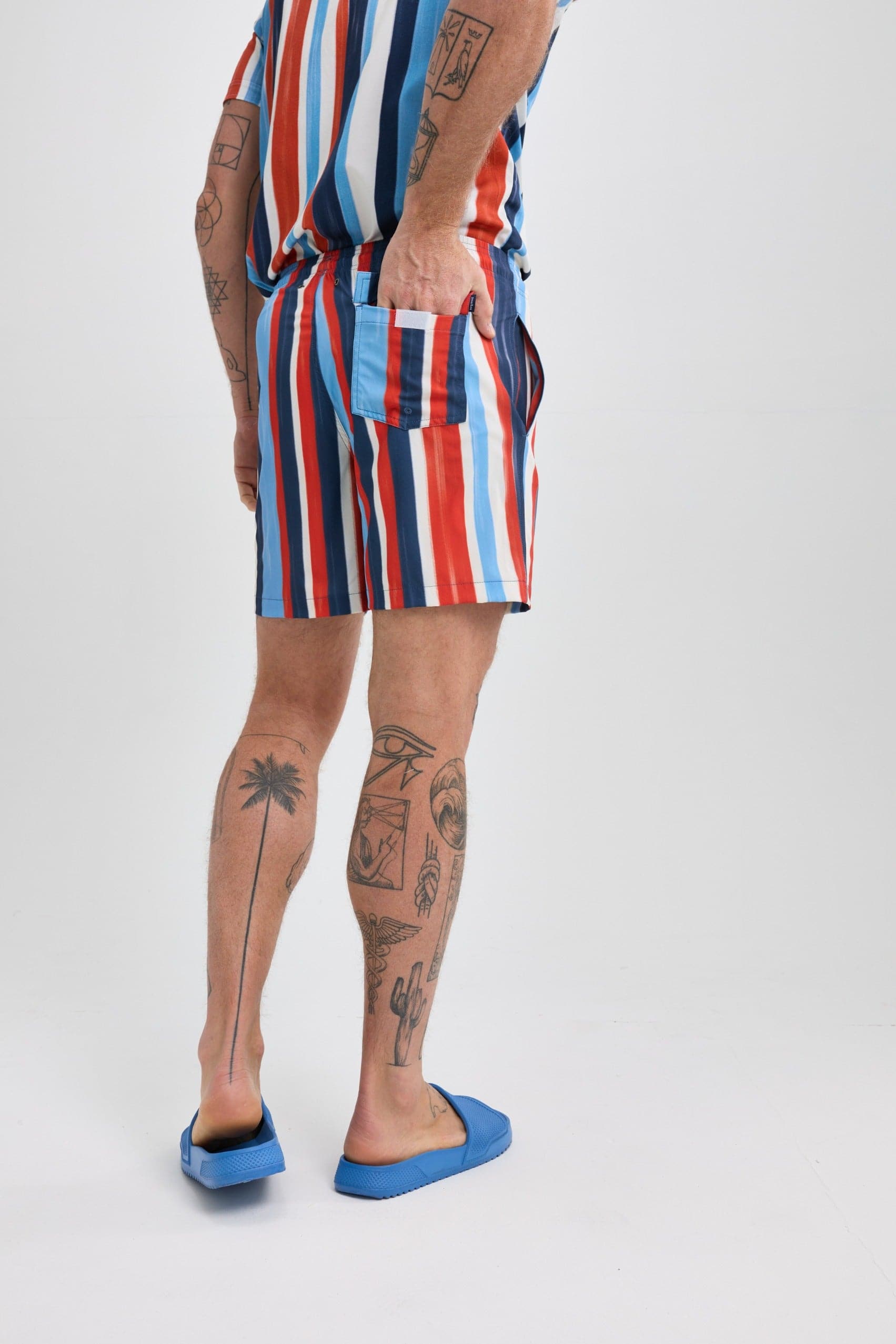 As usual, our Blue Stripped Resort Swimshorts are made with our signature stretchy, quick-drying synthetic fabric and printed with fade resistant dyes to withstand the sunniest of days. These styles have a drawcord elastic waistband and a 7" inseam so they hit around the mid thigh. Just like the classic sold swimshorts this season, we finished our patterned swimshorts with 3 pockets that have embroidered holes to help the water drain quickly.