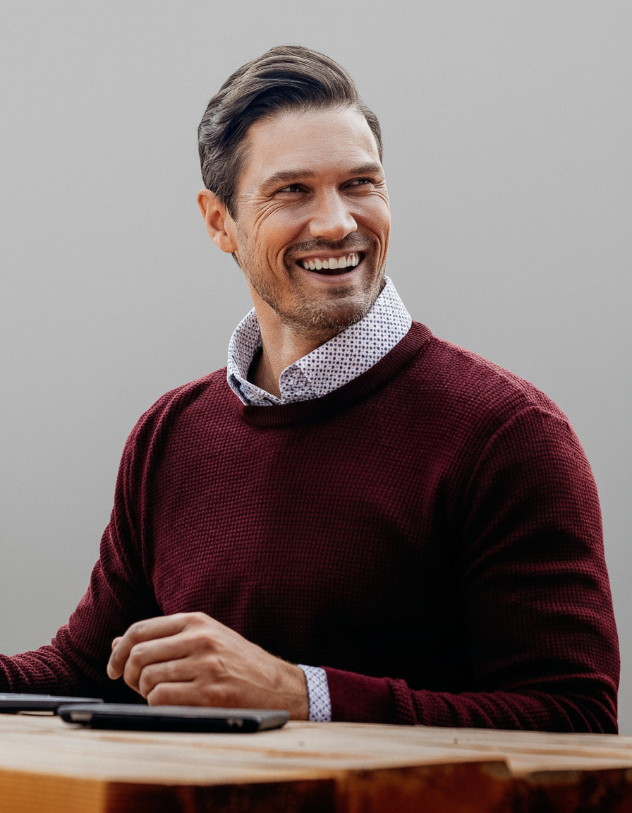 Available in charcoal, teal, and the featured burgundy, this sweater is versatile enough to be layered over a shirt or worn on its own for a luxurious look.