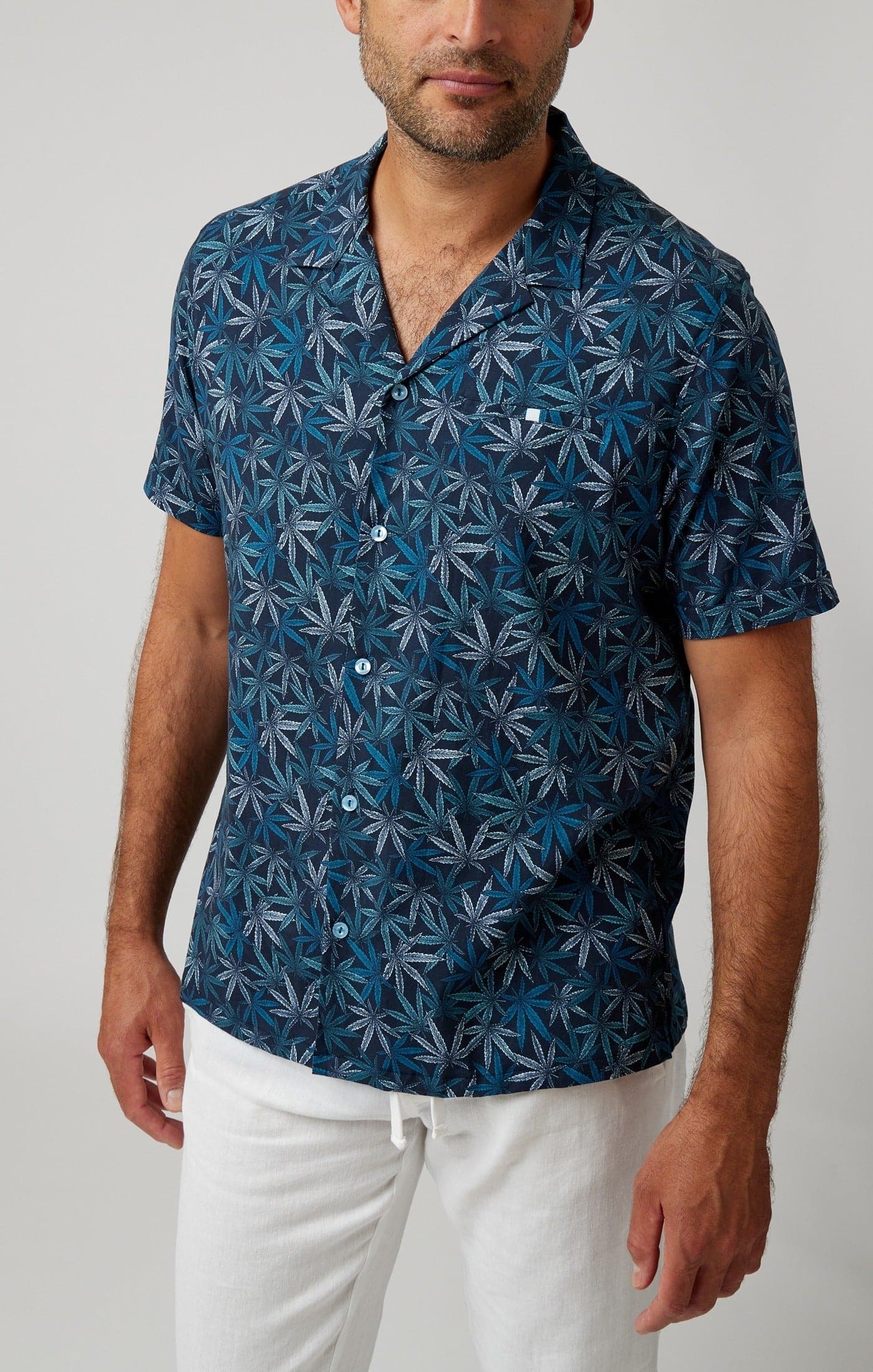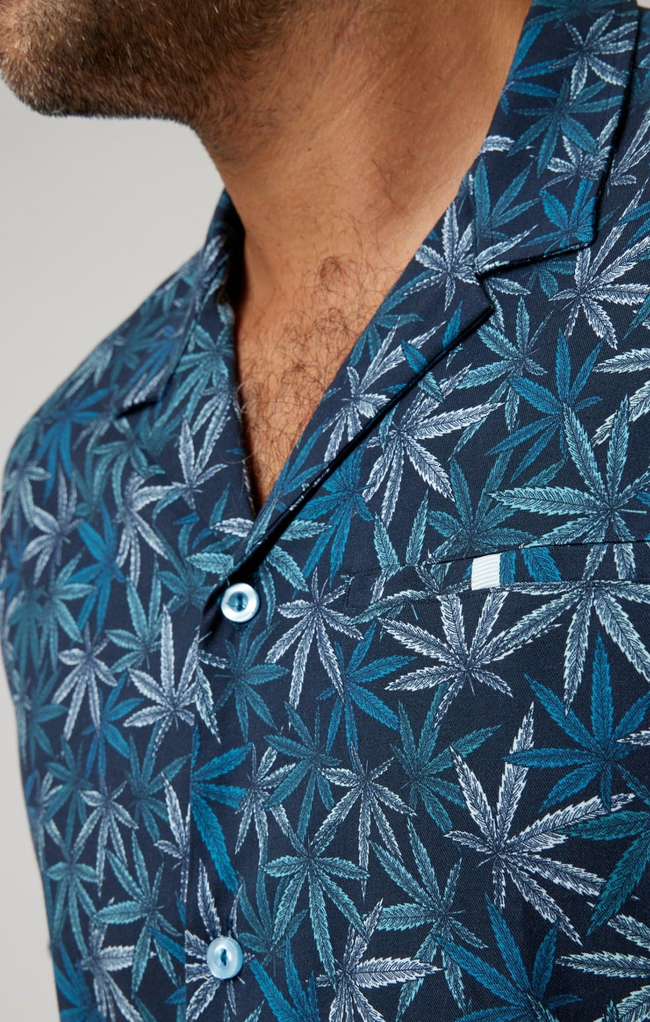 The shirt's design features a sophisticated navy base, adorned with a tasteful leaves pattern that evokes the feeling of a breezy summer day under the shade of lush foliage. This bold pattern, thoughtfully created and curated in-house, is complemented by subtle yet timeless details that allow the shirt to stand out in any setting. Paired with matching swim shorts, it becomes your go-to set for this summer, ensuring you're always ready for a dip in the pool or a day at the beach.
