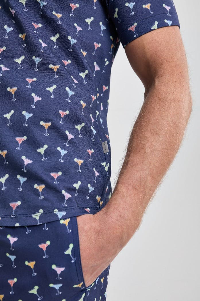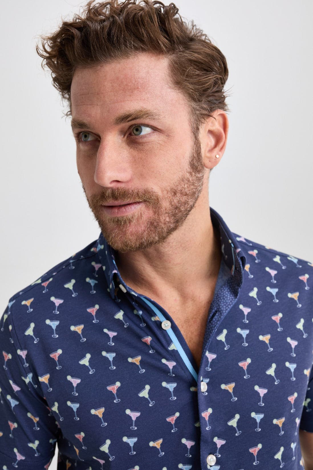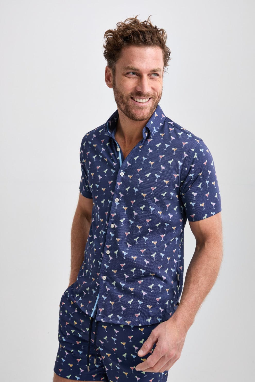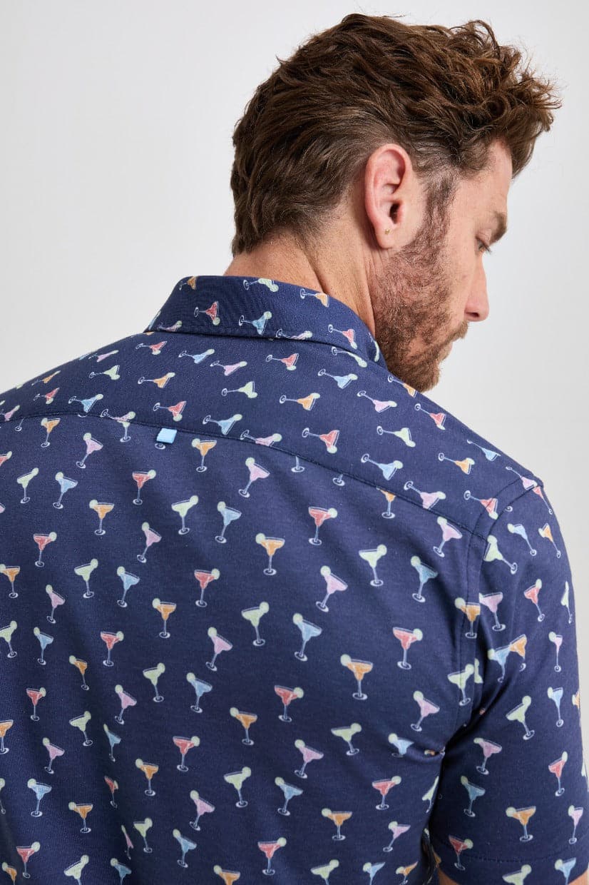 Introducing the Navy Margarita Short Sleeve Print Shirt, a standout piece in our T-series program that effortlessly combines high-performance functionality with distinctive style. Crafted from our innovative DryTouch® jersey, this shirt is a blend of 64% Cotton and 36% DryTouch® Poly, offering a fabric that feels as natural and soft as it is technologically advanced. The navy base is adorned with a playful margarita print, perfect for summer outings or adding a splash of fun to your everyday wardrobe. This shirt is not only a visual delight but also a marvel of fabric technology, designed to keep you comfortable with its breathable, moisture-wicking properties. The sleek detailing and unique summer pattern make it a must-have for those who value both style and comfort.