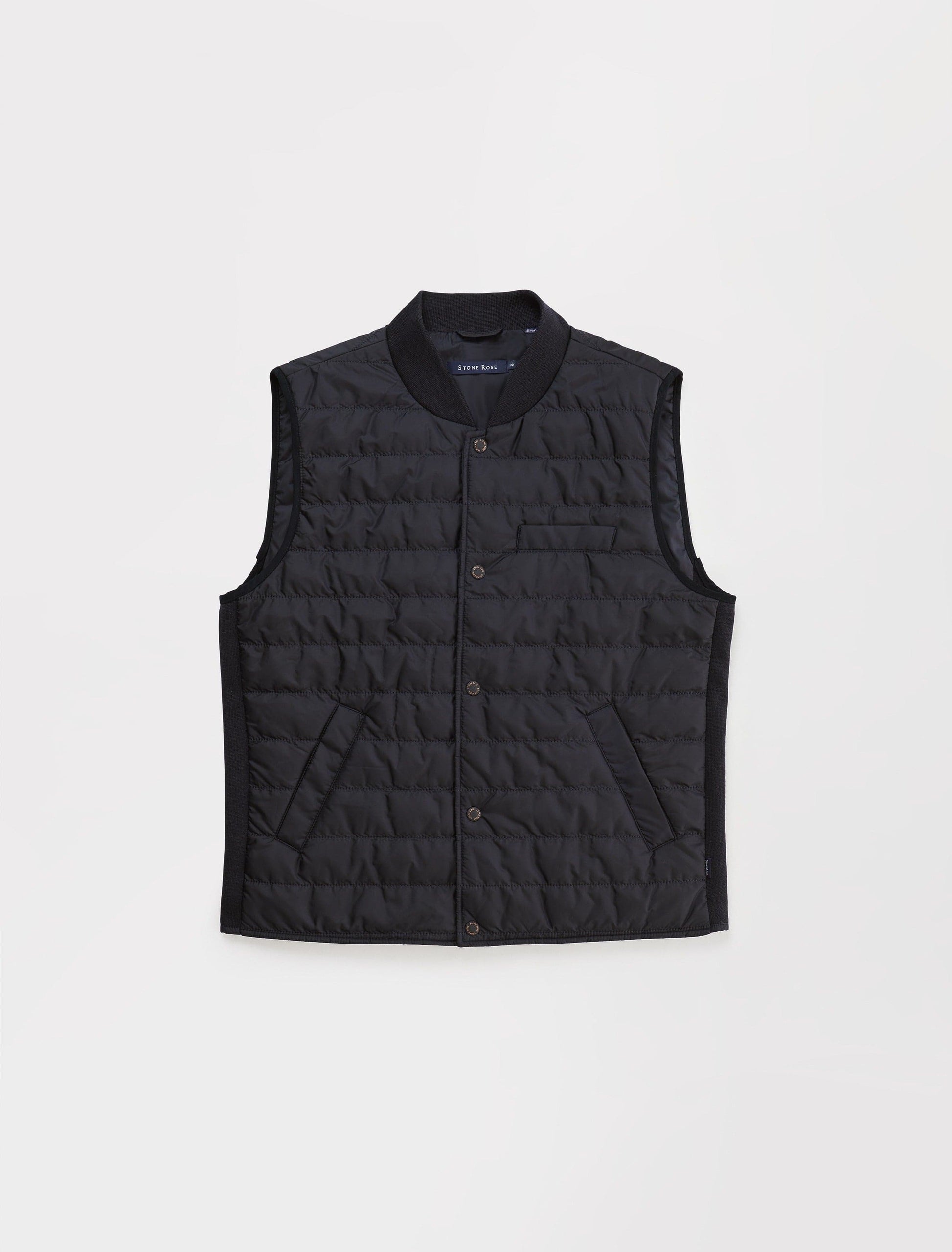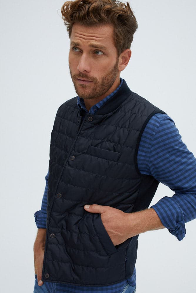 Navy Puffer Vest An ideal layering piece for fall with mixed media elements that add style and comfort. The front is made with a water repellent padding while the collar and sides are made with a stretch rib knit. Our hybrid vest features easy to close snaps and practical pockets. |