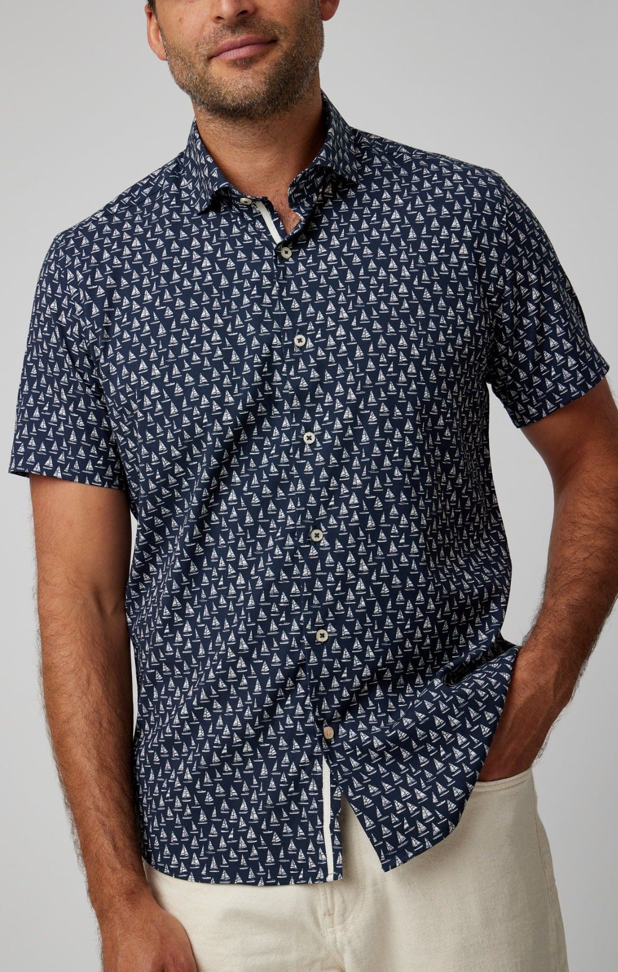 The design features a deep navy base adorned with elegant sailboats, capturing the essence of nautical adventure. This fun, yet sophisticated pattern has been thoughtfully created and curated in-house, ensuring a unique look that's bound to turn heads. Whether you're yacht-hopping or simply enjoying a casual day out, this shirt will keep you looking sharp and feeling comfortable.