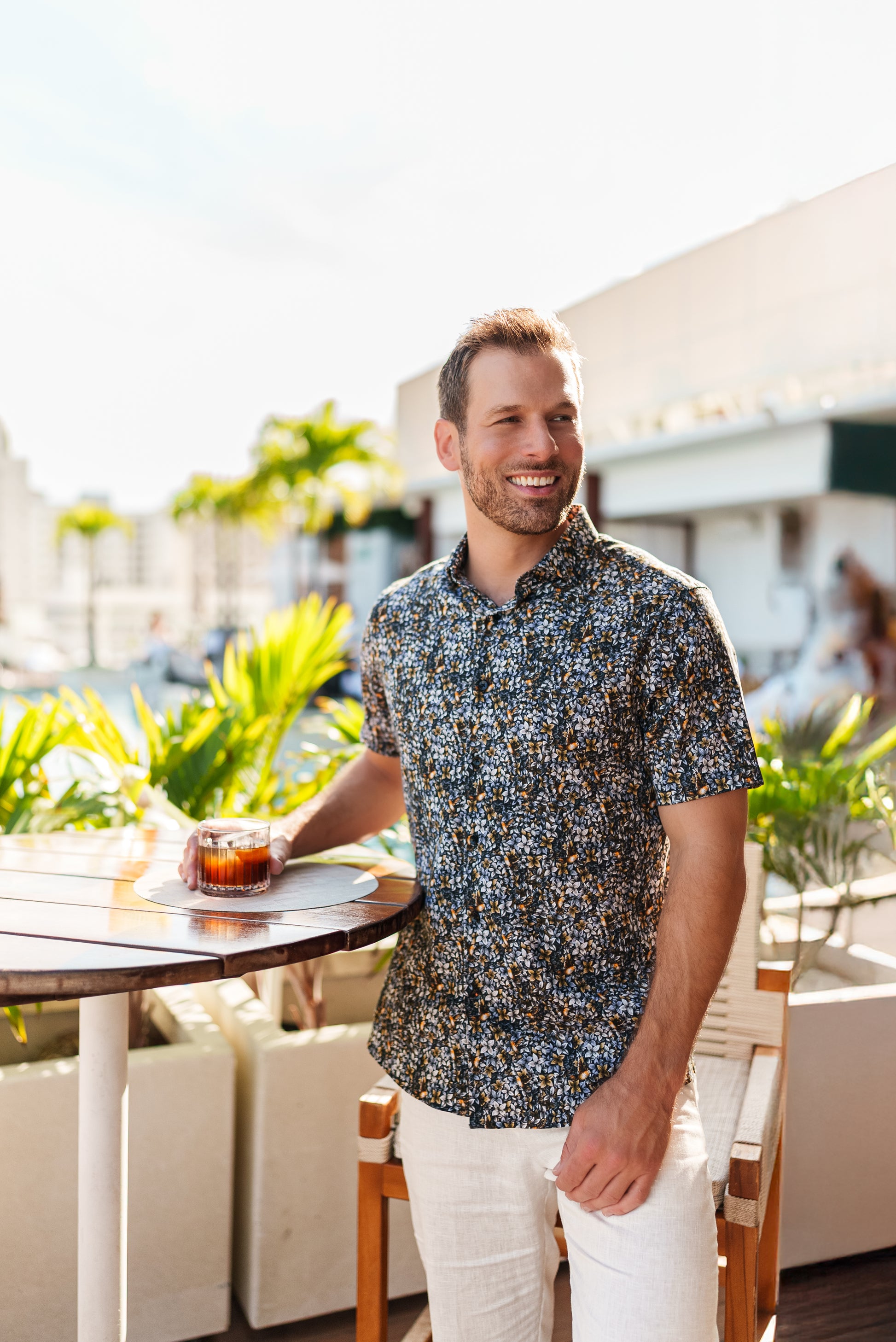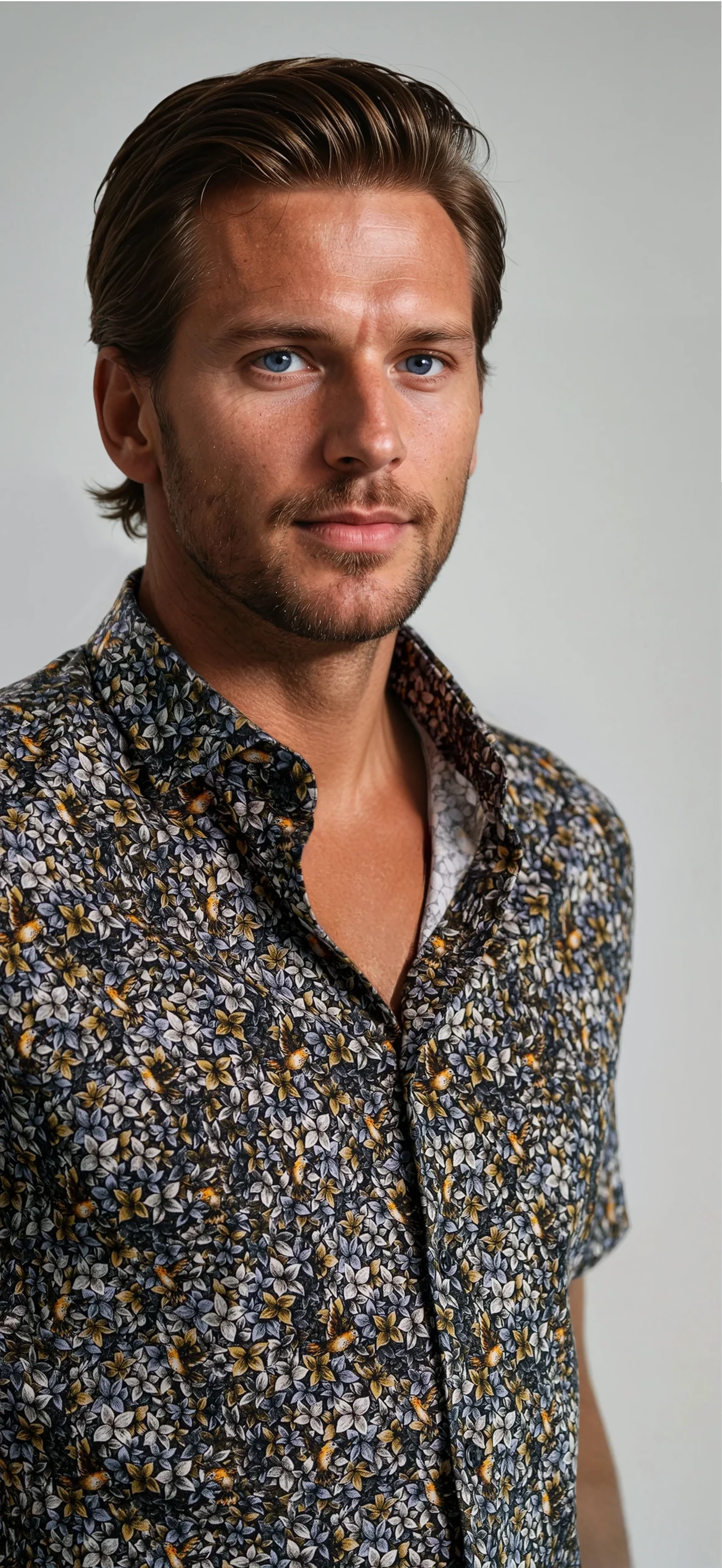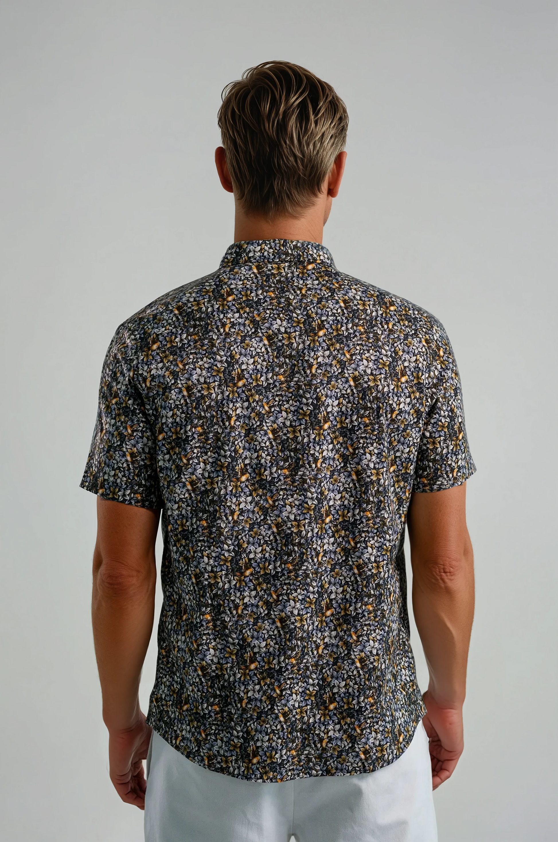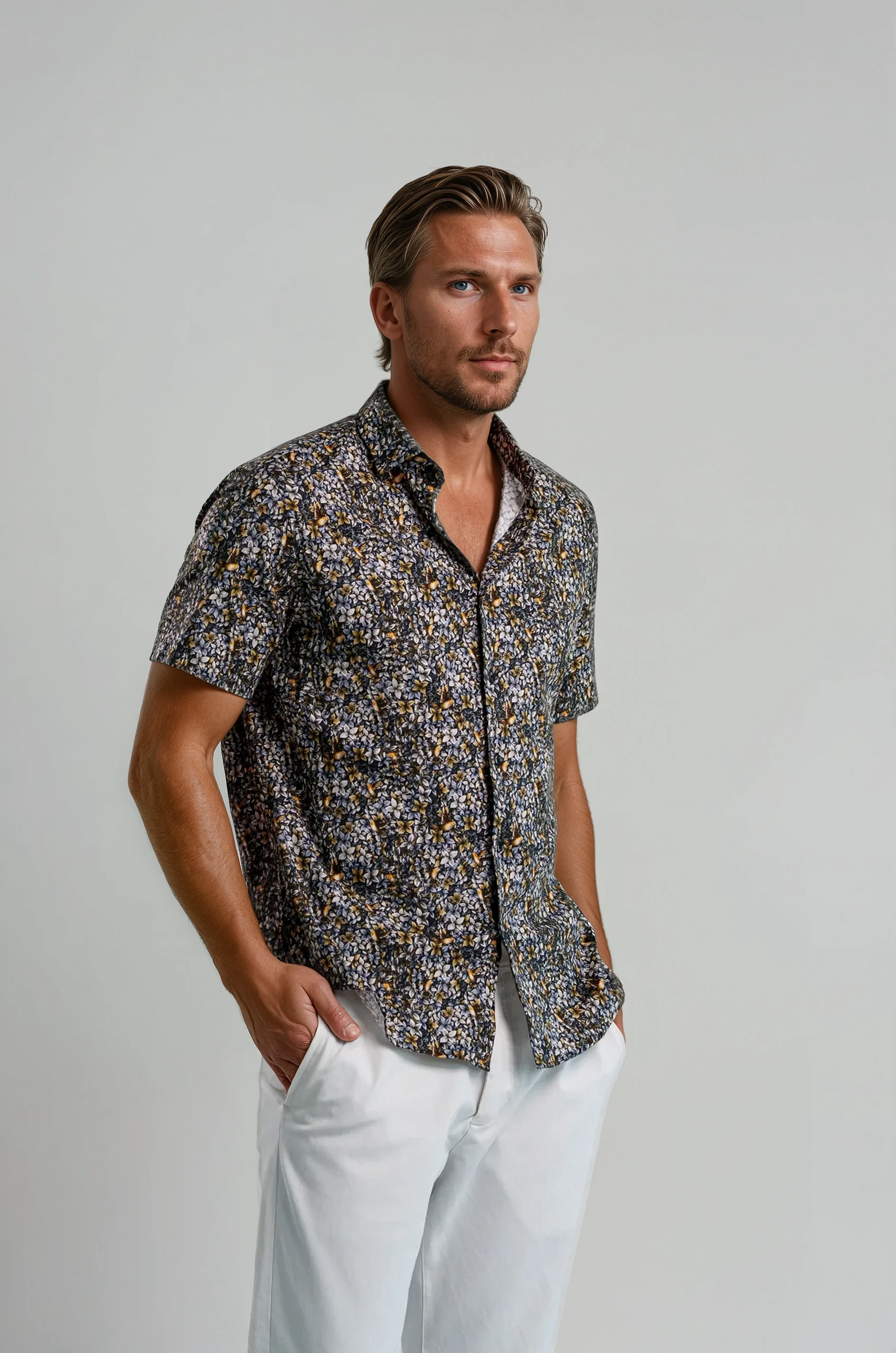 Channel nature's elegance with the NOVA Beige Flight & Flora Shirt This short-sleeve, standard-collar shirt offers a refined floral design with a soft, summer-ready color palette.