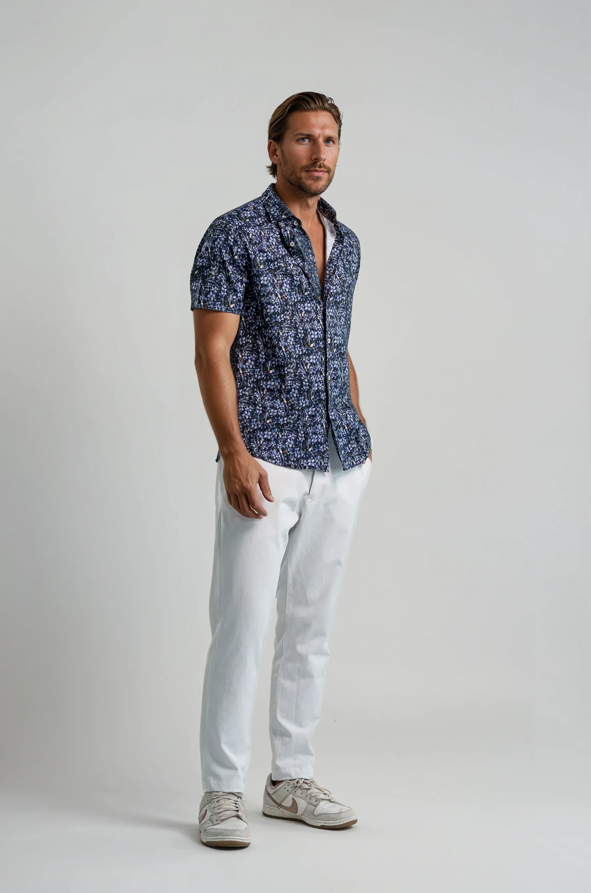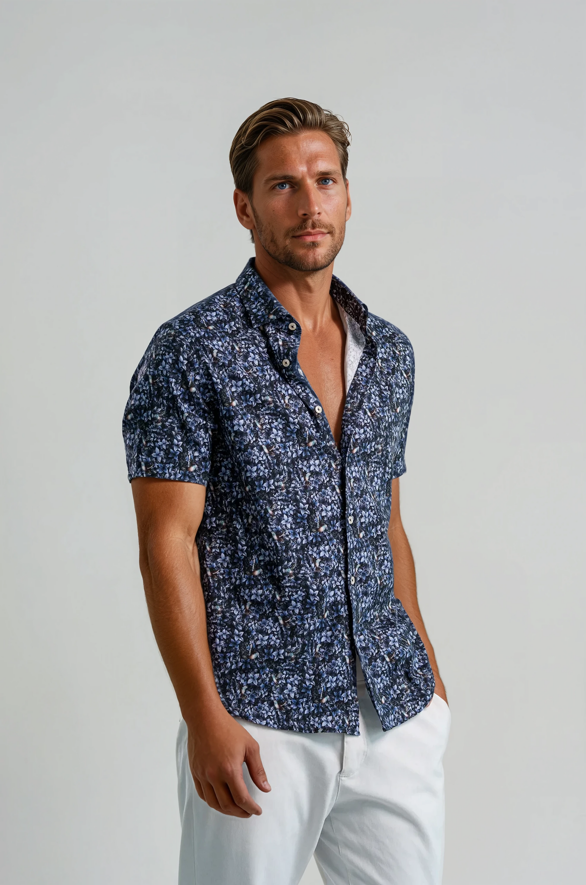 Elevate your wardrobe with the refined charm of the NOVA Flight & Flora Shirt in "Dark Denim." This short-sleeve, standard-collar design blends modern style with nature-inspired detail, perfect for any warm-weather occasion.