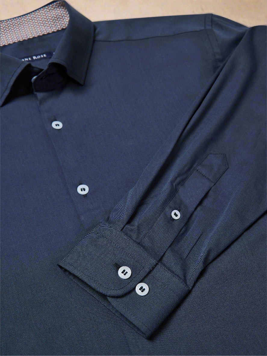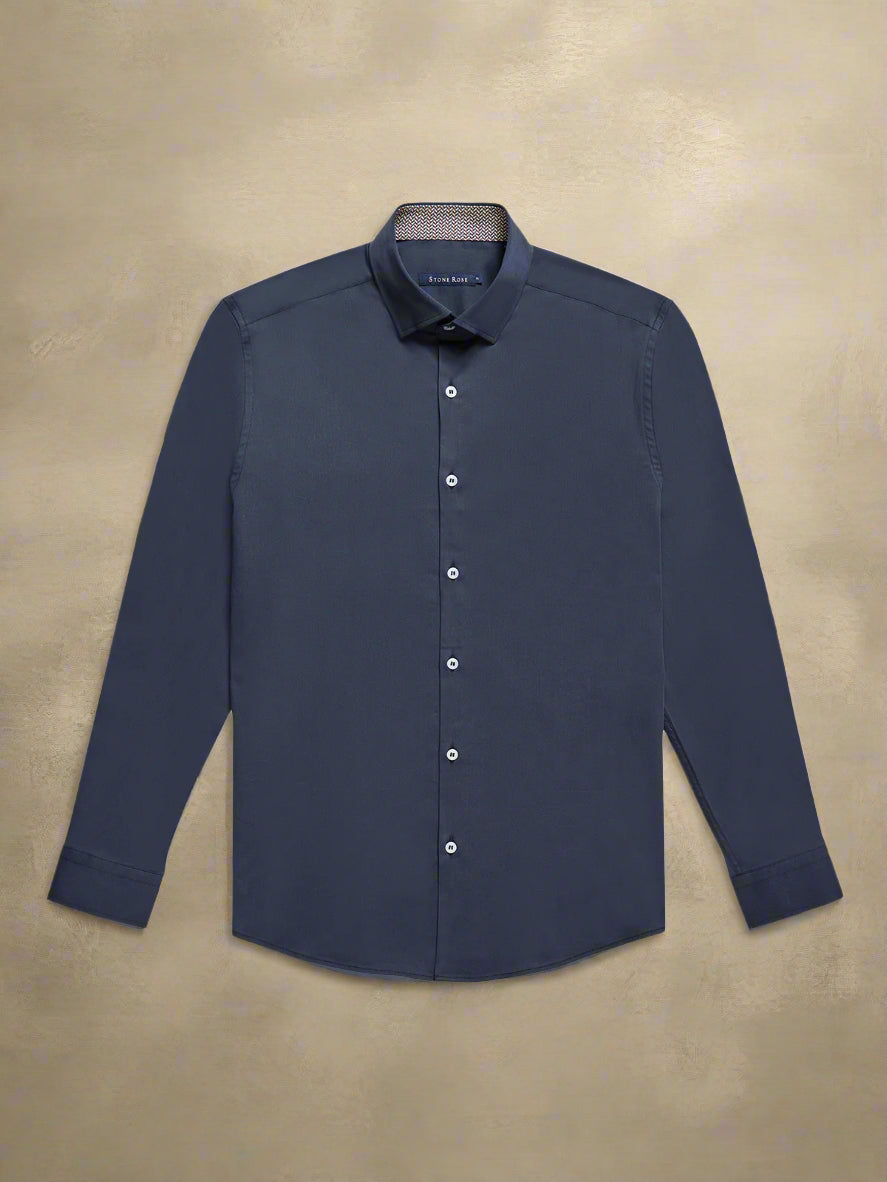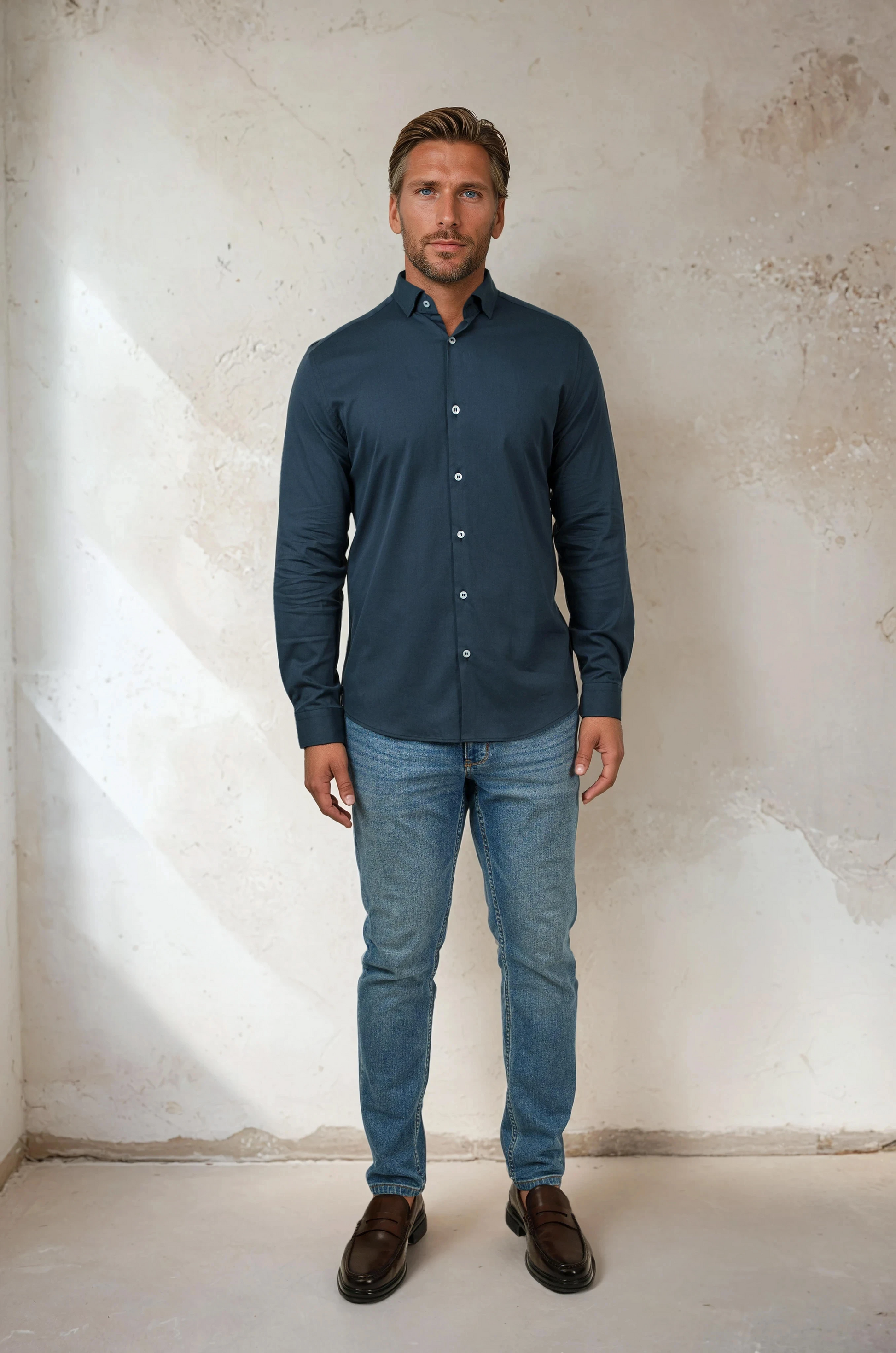 The NOVA - Dark Navy Legacy Shirt from our Nova Collection is designed with an elegant drape and a smooth, peachy finish. Its clean silhouette and modern feel make it a versatile option for both casual and elevated looks.