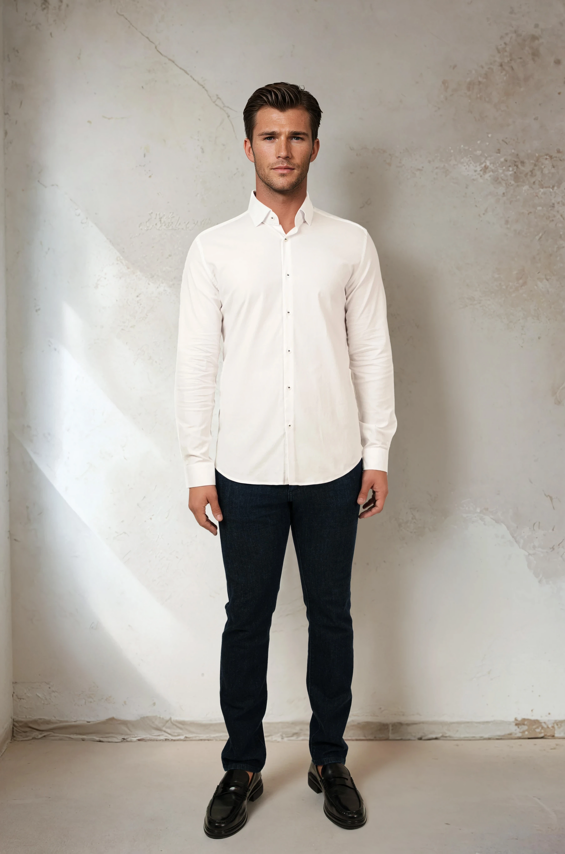 The NOVA - White Legacy Shirt from our Nova Collection is designed with an elegant drape and a smooth, peachy finish. Its clean silhouette and modern feel make it a versatile option for both casual and elevated looks.