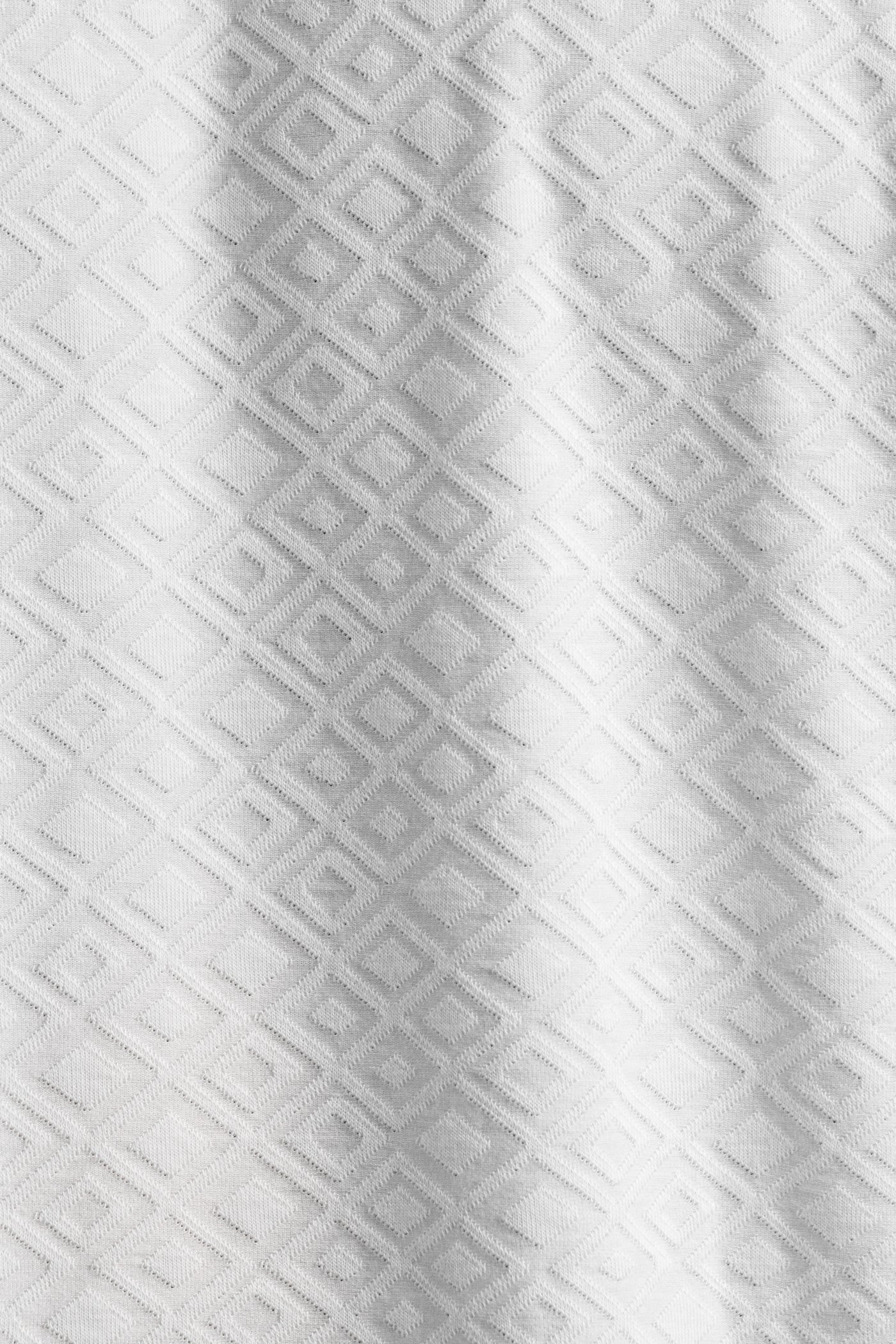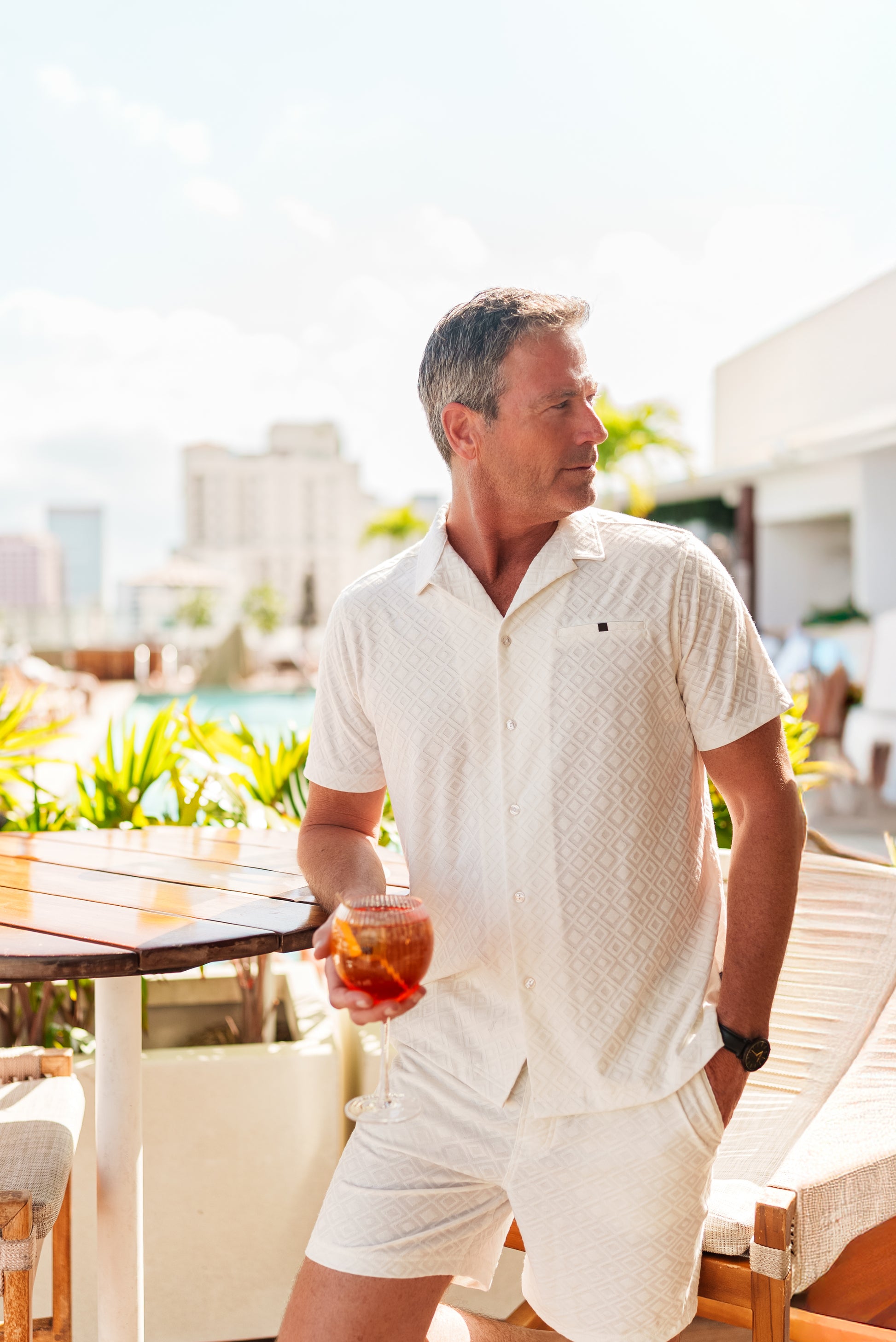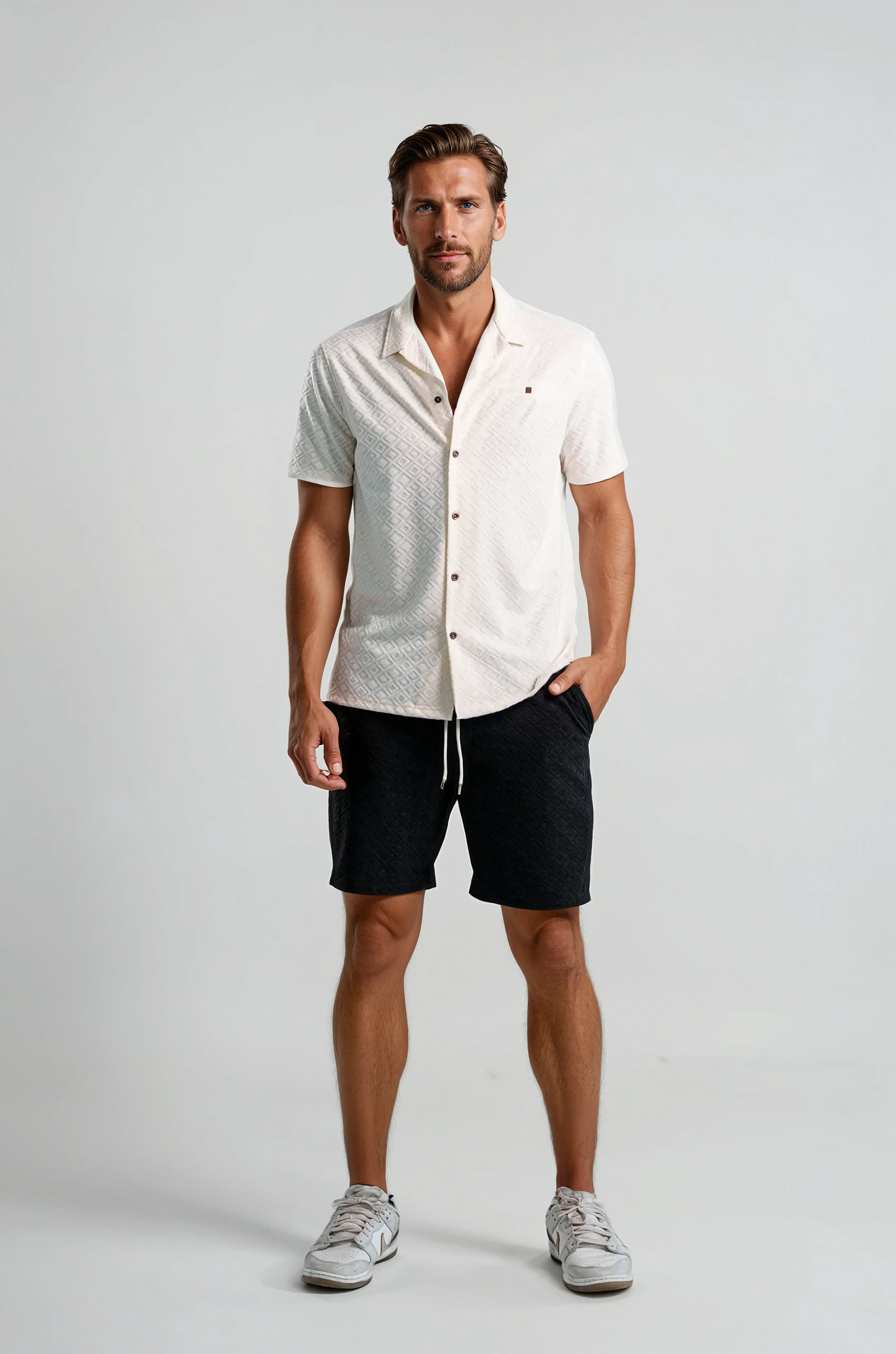 Exude effortless elegance with the PALMA Jacquard Topiary Diamond Geo Short Sleeve Shirt in "Egret," a versatile essential for your summer wardrobe.