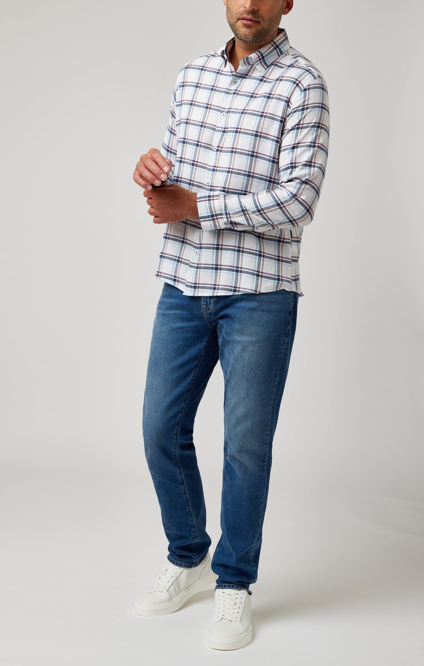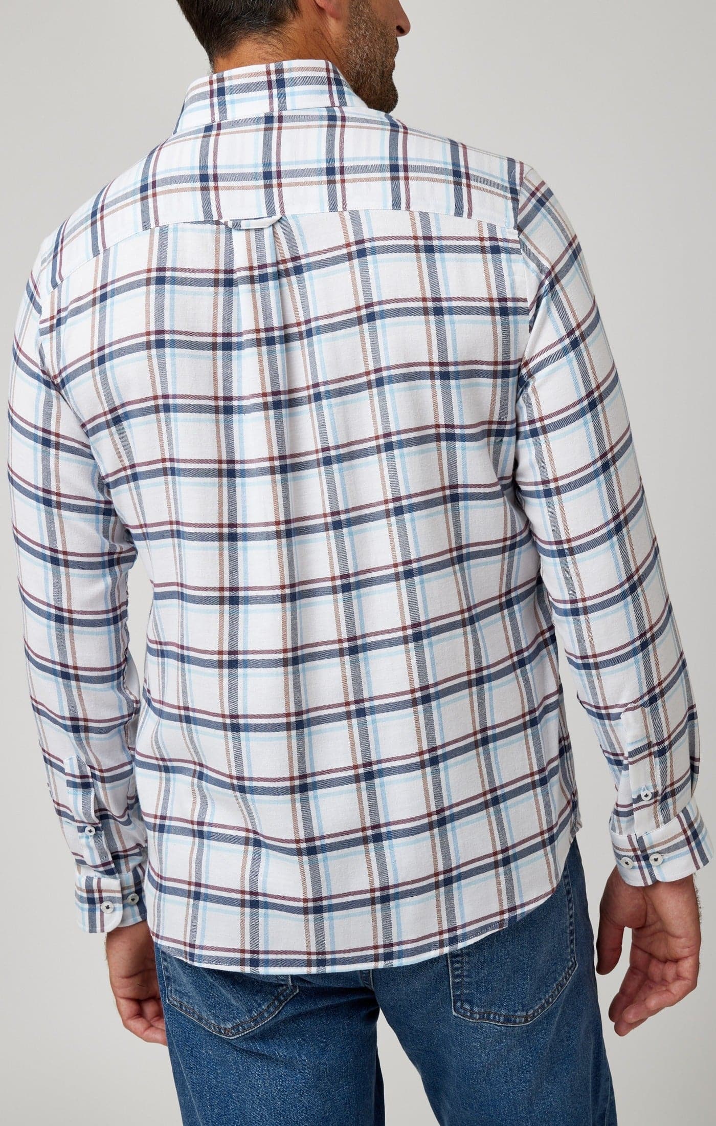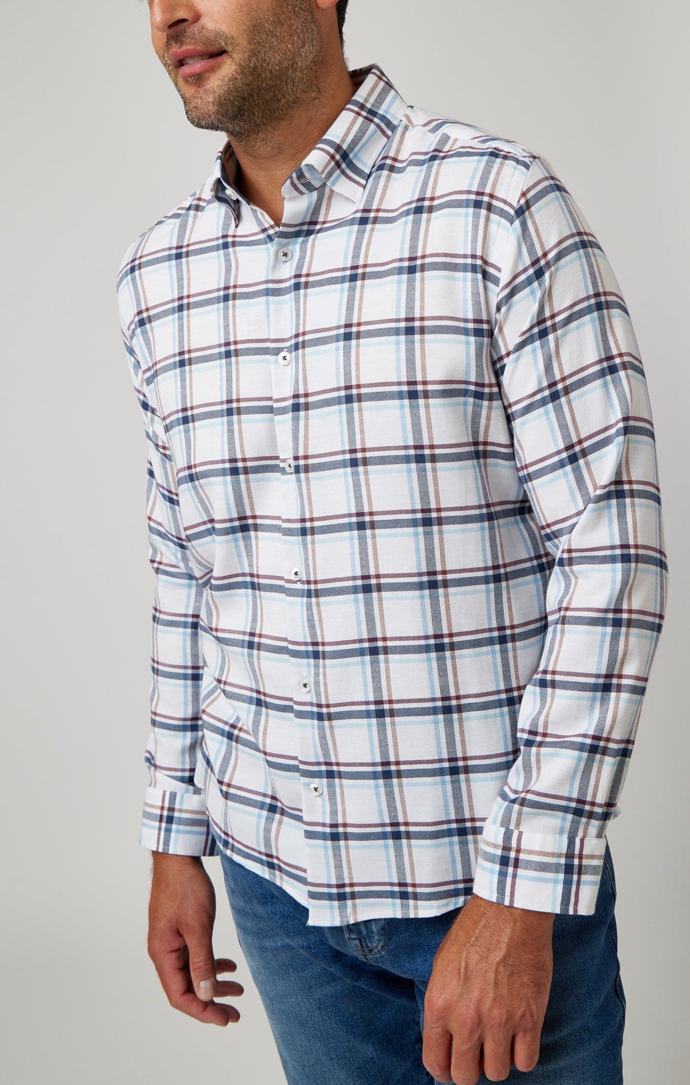 Our goal with these shirts was to bridge the gap between classic and modern styles in menswear. To execute this, we designed our own traditional check prints and opted to weave them for a richer loom than printing. Next, we selected one of our advanced stretch fabrics with DryTouch, specifically engineered to excel moisture and allow air to flow in. Finally, we brushed the fabric for an unparalleled softness and drape.