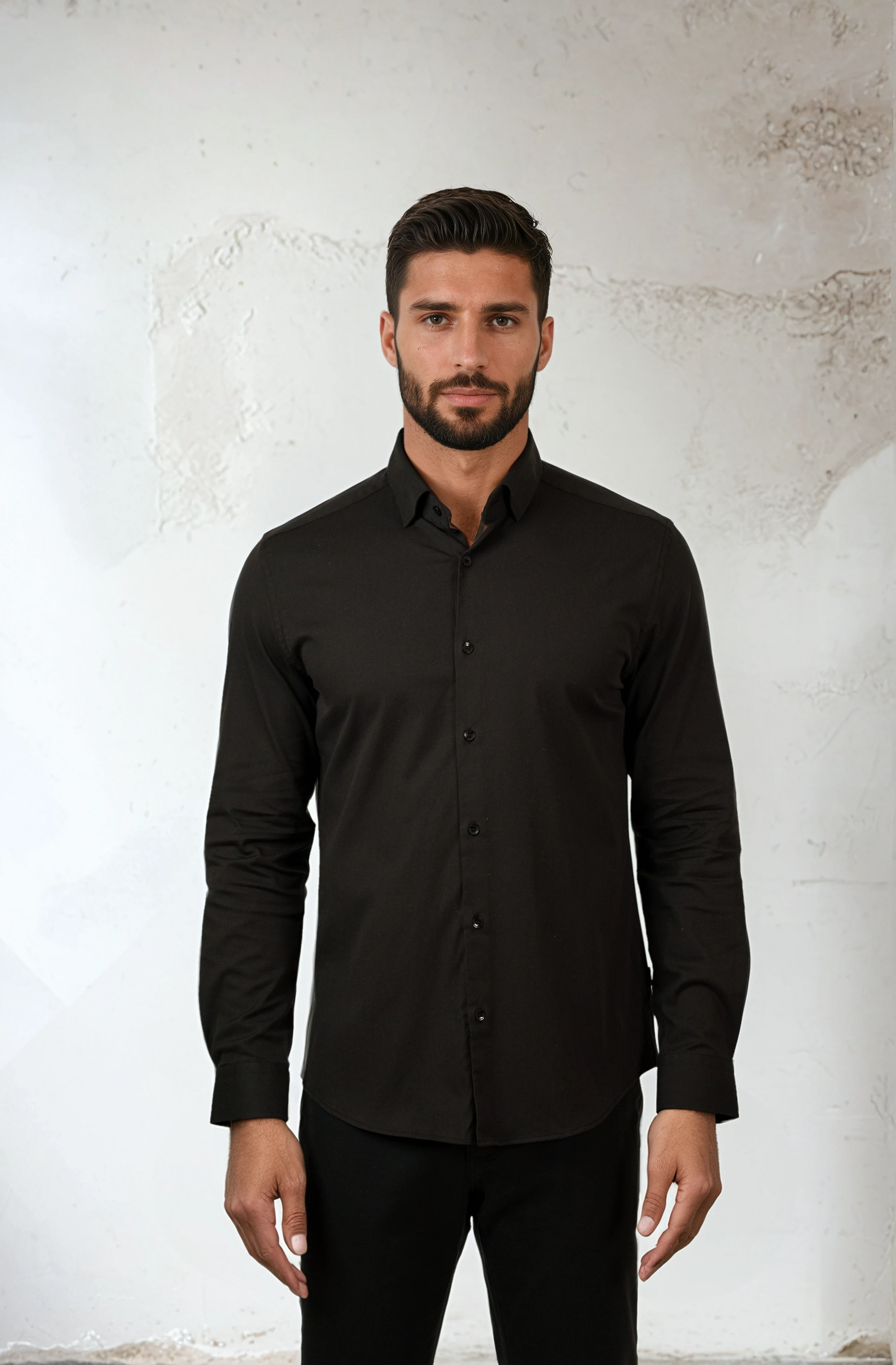 The NOVA - Black Legacy Shirt from our Nova Collection is designed with an elegant drape and a smooth, peachy finish. Its clean silhouette and modern feel make it a versatile option for both casual and elevated looks.