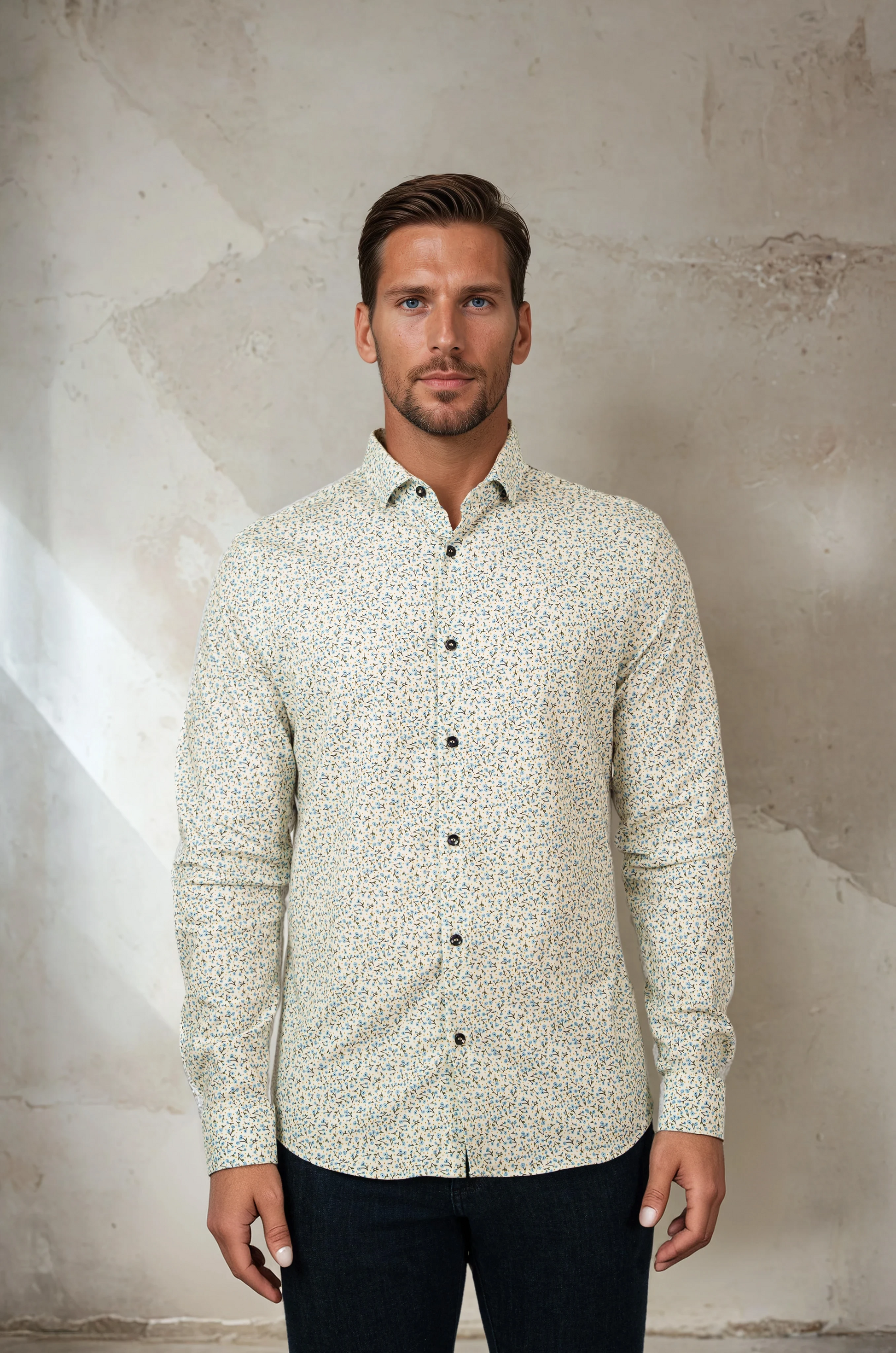 The NOVA - Light Blue Meadow Ditsy Shirt from our Nova Collection is designed with an elegant drape and a smooth, peachy finish. Its clean silhouette and modern feel make it a versatile option for both casual and elevated looks.